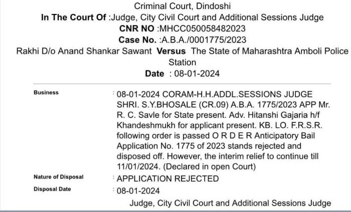 The Mumbai Court denies bail to Rakhi Sawant in a case filed by Adil Khan Durrani, accusing her of publishing and transmitting sexually explicit material.An F.I.R came to be registered with Amboli Police Station as per the complaint received from Rakhi’s Husband Adil Khan Durrani for not just transmitting but also publishing the private picture of Adil and the couple’s intimate and obscene media gears on various media platforms. Adil Khan Durrani’s *Adv Suhail Shariff, says “The court has contemplated all the submissions and after hearing both the sides at length by giving due consideration to facts and seriousness of the offence rejected the pre-arrest bail”