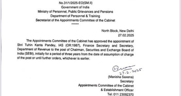 The government on Thursday appointed Tuhin Kanta Pandey as the Chairman of the Securities and Exchange Board of India (Sebi), succeeding Madhabi Puri Buch, whose term ends on Friday.Pandey, a 1987-batch IAS officer of the Odisha cadre who is the current Finance Secretary, has been appointed as the Chairman of the Securities and Exchange Board of India for 3 years, the government order said.