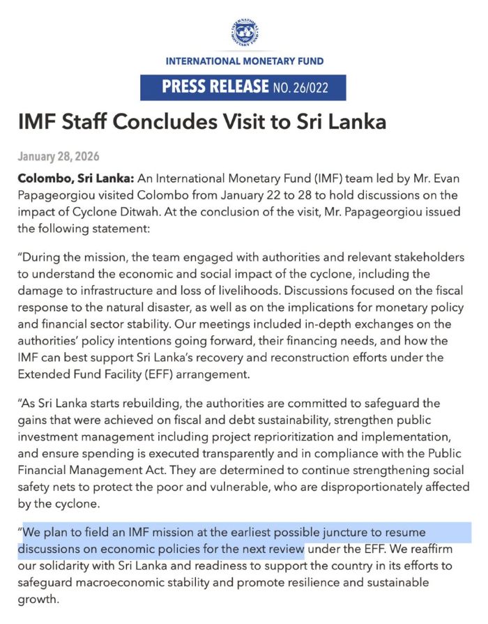 The IMF team engaged in detailed exchanges with authorities on policy priorities going forward and explored how the Fund can best support Sri Lanka under the ongoing Extended Fund Facility (EFF) arrangement. The IMF stated that it plans to field another mission at the earliest opportunity to resume discussions on economic policies for the next EFF review, reaffirming its solidarity with Sri Lanka and readiness to support macroeconomic stability, resilience, and sustainable growth.