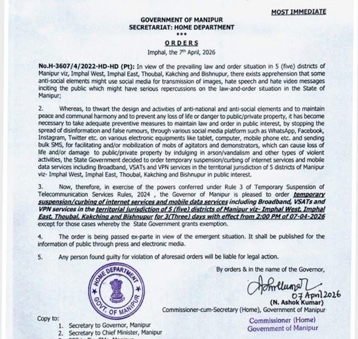 In Manipur, the State government on Tuesday ordered a temporary suspension of internet and mobile data services in five districts for three days amid unrest and security clampdown over the death of two children in a suspected rocket attack.The internet shutdown applies to Imphal East, Imphal West, Thoubal, Kakching and Bishnupur districts, according to a Home Department order issued April 7. A curfew was also clamped in Bishnupur, where the attack took place just after midnight on Tuesday. Authorities said the move was necessary to curb the spread of "disinformation and false rumours" and prevent activities that could disturb public order.
