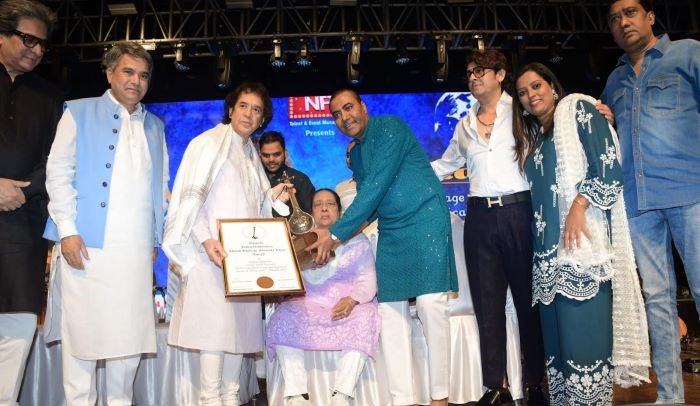 On the occasion of his third barsi (death anniversary), the esteemed 2nd Padma Vibhushan Ustad Ghulam Mustafa Khan Award was conferred upon Table maestro Padma Vibhushan Ustad Zakir Hussain at a ceremony held at the landmark Shanmukhanda Hall in the city. The award was presented by Khan Saab’s wife Amina Ghulam Mustafa Khan in the presence of the family, Khan Saab’s sons Qadir Mustafa Khan, Murtuza Mustafa Khan, Rabbani Mustafa Khan and Hasan Mustafa Khan, his daughters, while daughter-in-law and presenter from NR Events and Talent Management Namrata Gupta Khan played perfect host to everyone that attended the event. The occasion, marking the third barsi of the late singer also witnessed a mesmerising concert titled ‘Haazri’ by Padma Shri Sonu Nigam, the living legend’s tribute to the late maestro and his Guru, Ustad Ghulam Mustafa Khan, and undeniably the highlight of the evening. Sonu Nigam belted out the best of his songs from his musical repertoire, leaving a houseful of audience mesmerised and wanting for more! The evening also saw a bevy of singers, musicians, celebrities and dignitaries walk in hordes including Suresh Wadkar, Hariharan, Talat Aziz, MLA Ashish Shelar, philanthropist Dr. Aneel Kashi Murarka, comedian Zakir Khan among many others.