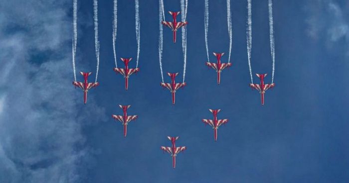 The sky became their canvas as nine jets carved intricate formations—loops, barrel rolls, and mirror manoeuvres—all executed with clockwork precision. The ‘Bomb Burst’ manoeuvre saw them explode outward in a dazzling spectacle, saffron and white smoke trailing in perfect symmetry. Then came the ‘Heart in the Sky,’ a symbol of passion and pride, drawing gasps of wonder from the crowd.