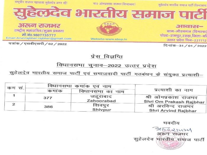 Main opposition Samajwadi Party ally Suheldev Bharatiya Samaj Party announced its two candidates for UP Assembly polls. In this list father and son have been included. Party Chief and strong critic of BJP Mr Om Prakash Rajbhar will contest from Zahoorabad seat in Ghazipur district. He was elected from same seat first time in 2017 polls. In 2012 elections Samajwadi Party leader Ms Shadab Fatima was elected. Rabhar's son and party's General Secretary Arvind Rajbhar will contest from Shivpur constituency in Varanasi district.