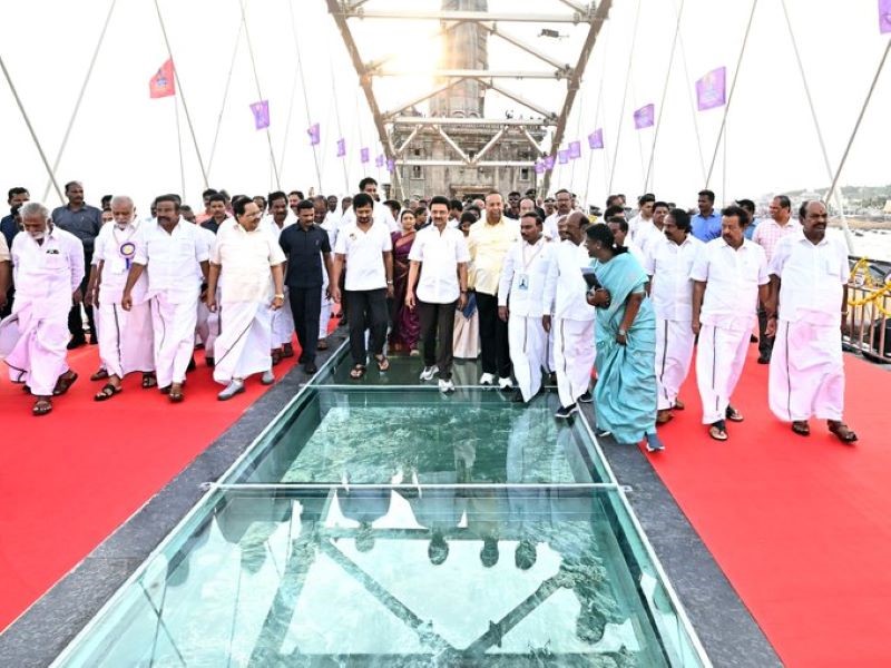 In Tamil Nadu, the iconic tourist destination Kanyakumari had added another jewel to its crown. India’s first glass bridge over sea was inaugurated on Monday, December, 30, 2024. Tamil Nadu Chief minister MK Stalin unveiled the classic glass bridge that connects the 133 ft tall Saint Tiruvalluvar statue and the Vivekananda rock Memorial. The bridge would allow the tourists to enjoy a breezy walk between the landmarks while seeing through the wavy sea underneath. Constructed at Rs 37 crores, the 77 metres bridge was inaugurated as part of silver jubilee celebration of the Tiruvalluvar statue, now renamed as statue of Wisdom by the state government.Earlier, tourists had to rely on a ferry service to travel from the Kanyakumari boat jetty to the Vivekananda Memorial, and then on to the Thiruvalluvar statue.Designed like a bowstring arch, the glass bridge is as durable as it is visually striking. It is built to endure the region's harsh marine environment, capable of resisting the corrosive effects of salty sea air and potential damage from the frequent exposure to high humidity.